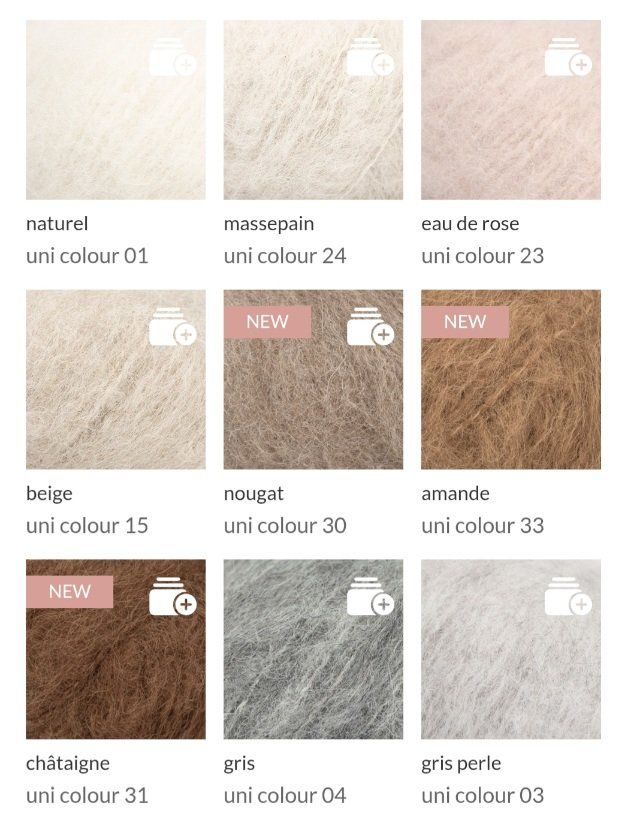 Une laine d'une qualité, chaude et d'aspect mohair, est disponible dans un nuancier sophistiqué allant des douces nuances beiges et grises aux fantastiques rouges et violets.